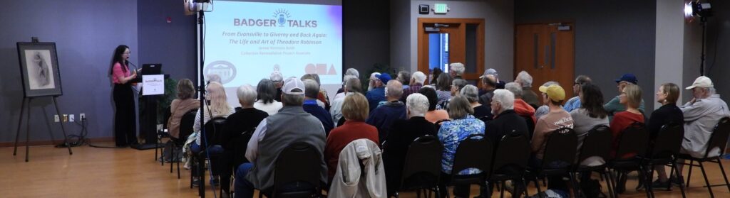 The presentation was the result of a year’s worth of planning and development by Grove Society members in cooperation with UW-Madison Badger Talks. Dr. Boldt, who is currently employed at the Chazen Museum at UW-Madison, agreed to prepare the lecture on her own time. Badger Talks, the speaker’s bureau for UW-Madison, brought the project to PBS Wisconsin, which sent a crew to live stream the presentation and record it for later broadcast on its program, University Place. There was a great turnout of residents and out-of-town visitors including several members of Robinson’s own family. The event represented a wonderful collaboration between different groups to keep Theodore Robinson’s legacy alive.